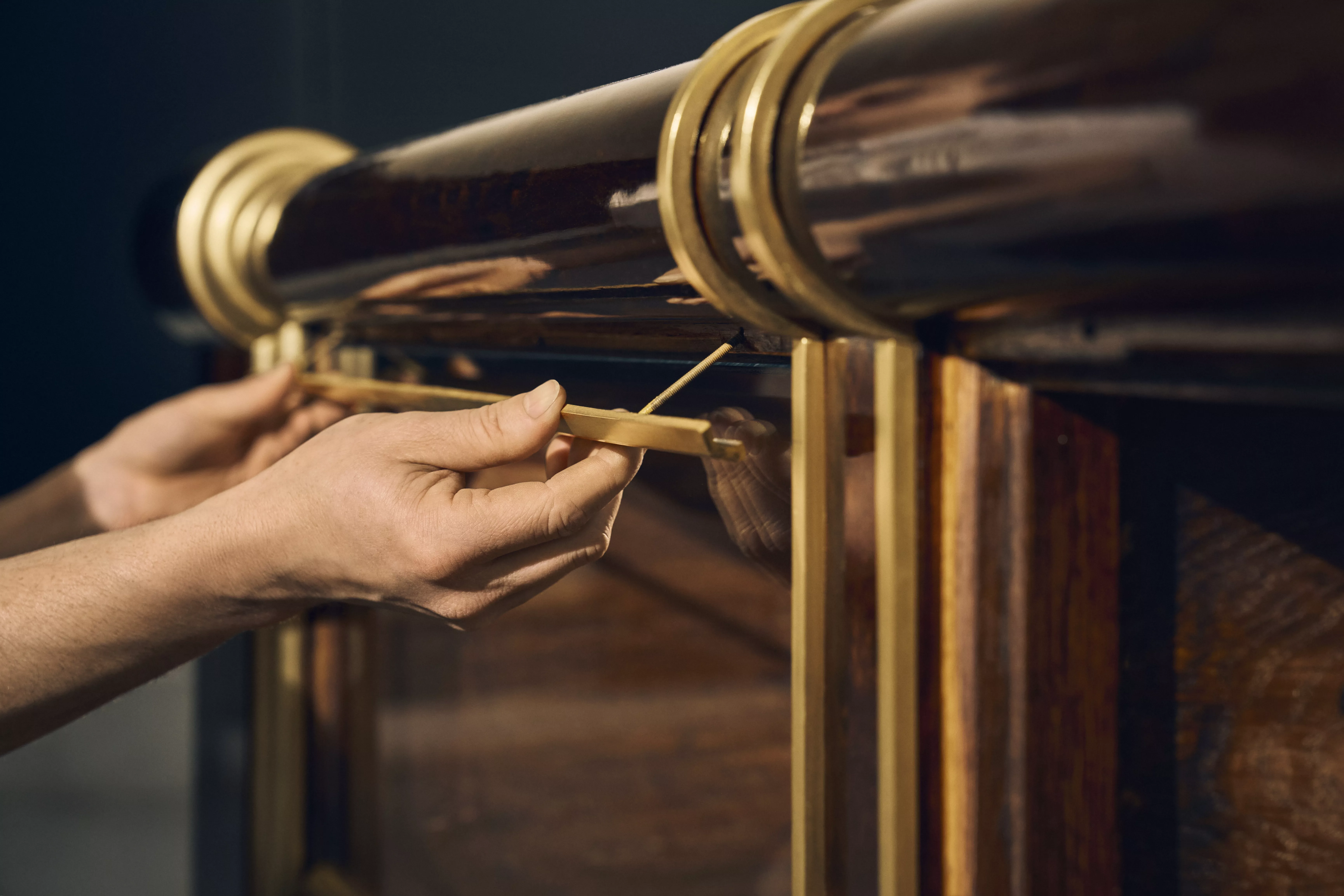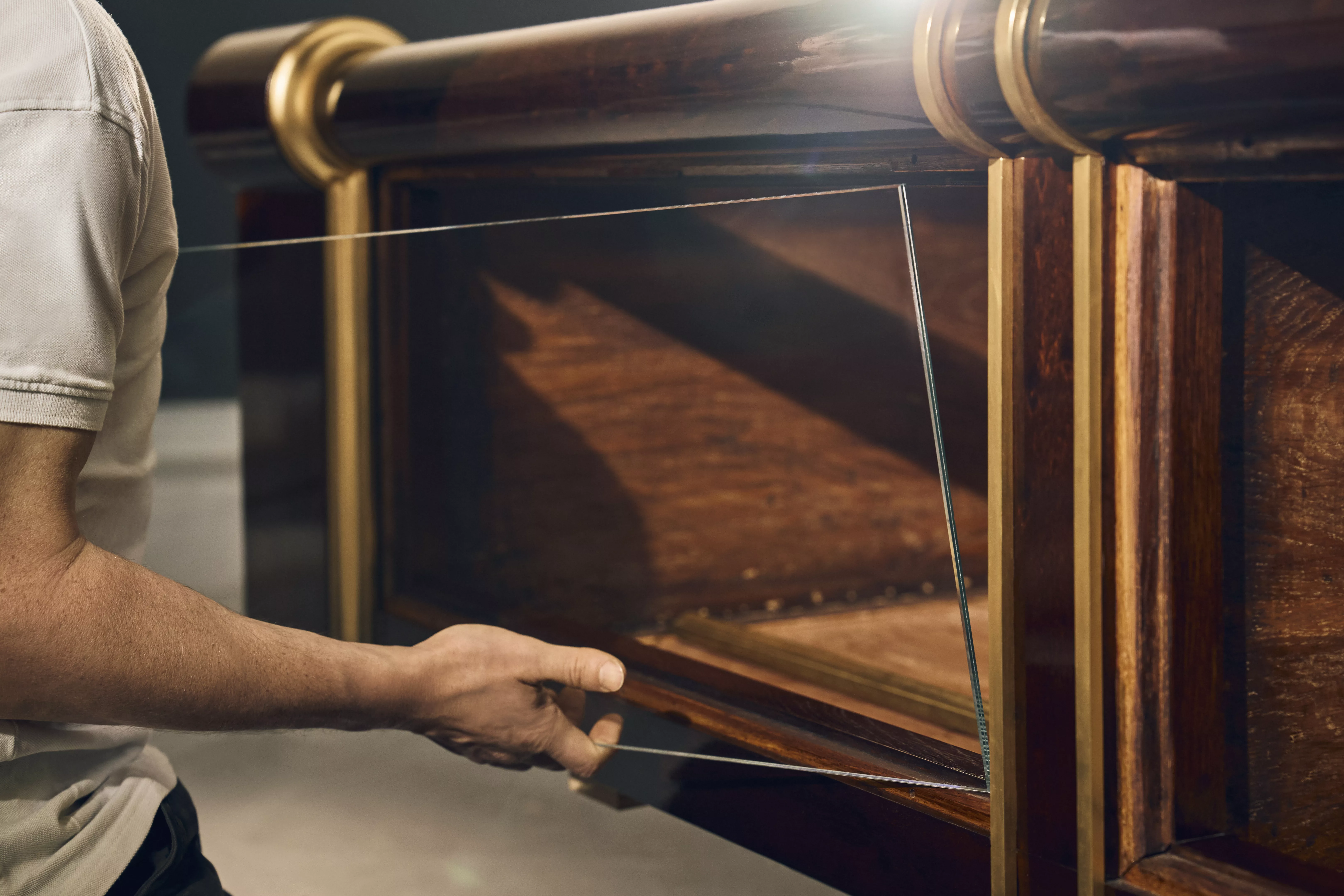 Des restaurateurs de l’atelier de menuiserie-ébénisterie du musée du Louvre ont présenté le travail effectué sur une vitrine en chêne plaqué d’acajou avec décors en appliques de bronze doré datant de 1822.